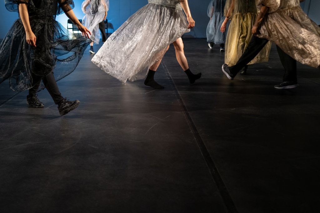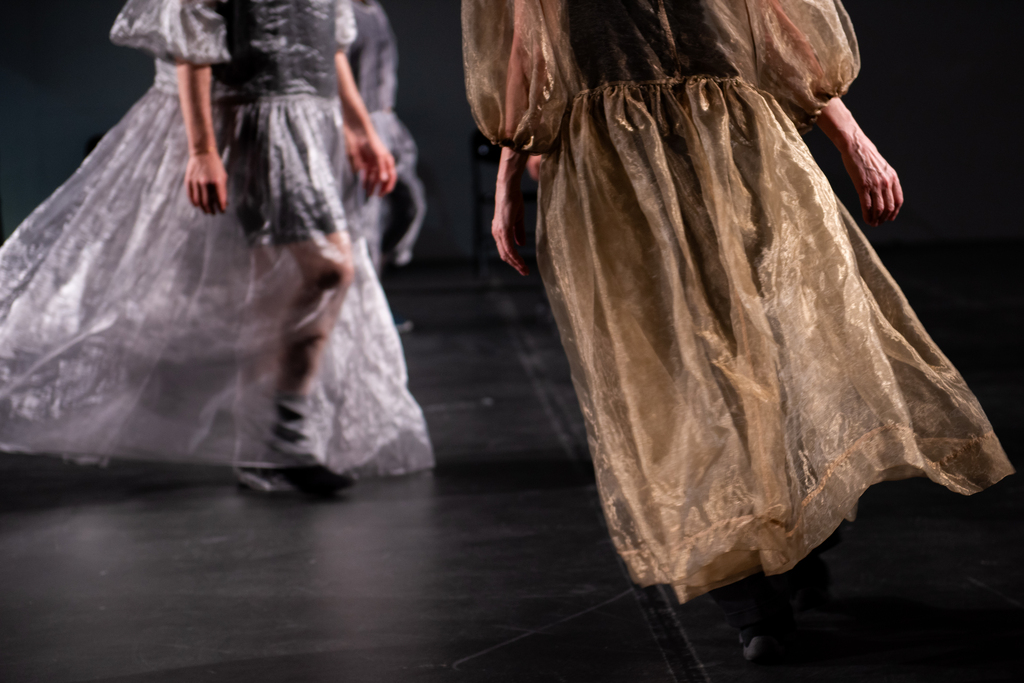 What do I have left of an era, that of the great balls in Vienna, that I did not know, and which persists above all in the form of music which is the only trace of it still alive and collectively shared. How can we reach this era, bring back its specter, rediscover its intensity without nostalgia and in a contemporary world? Traces, humming refrains, dresses emerge in black spaces, silhouettes come to life dancing alone and together and trying to bring back the famous ternary rhythm of the waltz. Spectral and fugitive universe, from which lost and found dances come to us.